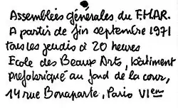 On 5 March 1971, the FHAR interrupted a meeting against the right to abortion,[3] and on 10 March it attracted public attention by disrupting and stopping a Radio Luxembourg broadcast by Ménie Gregoire on the topic of homosexuality.[4]