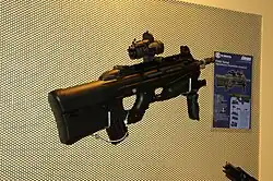 The FN F2000 is a 5.56×45mm NATO bullpup rifle, designed by FN Herstal in Belgium.[5] Its compact bullpup design includes a telescopic sight, a non-adjustable fixed notch and front blade secondary sight. The weapon has fully ambidextrous controls, allowed by a unique ejection system, ejecting spent cartridge casings forward and to the right side of the weapon, through a tube running above the barrel. The F2000 made its debut in March 2001 at the IDEX defence exhibition held in Abu Dhabi, in the United Arab Emirates.