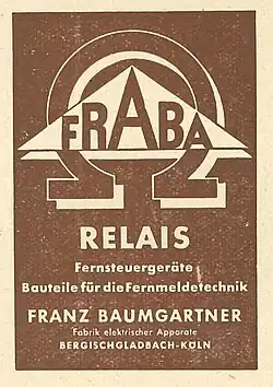 By the beginning of the 1940s, the company offered a varied and broad spectrum of products. Due to World War II, the enterprise at Cologne-Klettenberg is destroyed and the parent company is moved to Brüchermühle, but in 1945 production stagnates. In 1946 Franz Baumgartner reopens, with only 10 employees left, a new factory in Bergisch Gladbach. FRABA expands and actively participated in the postwar German Wirthschaftswunder with the restart of production, newly established contacts with foreign customers and further expansion of their domestic business. In 1951 FRABA was the biggest specialized factory in Germany for electrical switching devices. This was a result of the innovative character of the company, e.g. during World War II, a gas pressure relay with quicksilver was invented instead of using the familiar copper wires, because copper was very hard to come by.[6] FRABA flourished and relocated to the newly established operating space in Cologne-Niehl in 1953.
