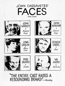 Faces is a 1968 American tragedy film written, produced, and directed by John Cassavetes—his fourth directorial work.[2] It depicts, shot in cinéma vérité-style, the final stages of the disintegrating marriage of a middle-aged couple, played by John Marley and newcomer Lynn Carlin. Cassavetes regulars Gena Rowlands, Seymour Cassel, Fred Draper, and Val Avery also star.[3]