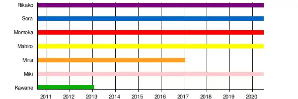On June 17, 2020, it was announced by Rising Production that after several discussions with the members, Rikako Inoue, Sora Nomoto and Mahiro Hayashida decided to end their contract with the agency, with Rikako also retiring from show business. Momoka Ito and Miki Shimomura will remain in the agency working individually.[9] Although the activities ended as a group, the agency revealed that the group have not disbanded and their future activities are "undecided".[10] After working at a beauty company for two years, Rikako Inoue began a career as an adult actress under the name Yotsuha Kominato.[11]