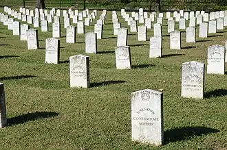 In 1861 a section in the eastern portion of the cemetery was set aside for burials related to the American Civil War; this section contains 442 graves of Confederate Army soldiers and eight of Union Army soldiers.[2][3] Most of the Confederate graves are marked "UNKNOWN CONFEDERATE SOLDIER."[2] Also buried is Confederate Congressman Hugh French Thomason (1826–1893).