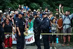 In addition to the July 2021 court action against the RCMP initiated by media outlets, Rainforest Flying Squad reported individual journalists and protesters had submitted over a dozen complaints against the RCMP by August 2021. Complaints included excessive force, confiscation of food and water, and unlawful apprehension of personal possessions, vehicles, and items providing media access, including a satellite dish.[38] The RCMP came under further criticism when a number of its officers were seen wearing thin blue line patches while on duty at the site, despite official RCMP guidelines forbidding the symbol.[39][40]
