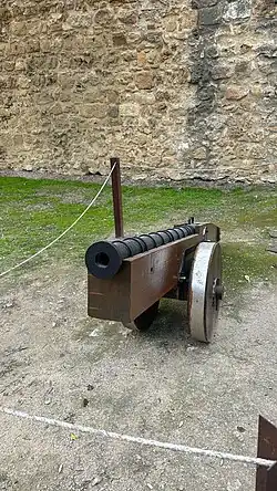 The falconet resembled an oversized matchlock musket with two wheels attached to improve mobility.[5] In 1620s Germany a breechloading version was invented, seeing action in the Thirty Years War.[6] Many falconets were in use during the English Civil War[4] as they were lighter and cheaper than the culverins, sakers and minions. During times of unrest, they were used by the nobility to defend their grand houses.[7]