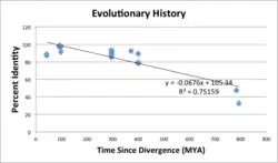 Evolutionary History of FAM78B comparing percent identity versus time (millions of years)