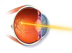 Treatment is largely aimed at reducing the amount of new blood vessel growth and preventing complications that may arise as a result, including retinal tears and detachments. Using a laser, an ophthalmologist burns the portions of the retina that are not supported by blood vessels, a technique known as laser photocoagulation.[1] By doing so, this tissue will no longer release molecules that stimulate blood vessel growth. If a retinal detachment occurs, laser therapy or surgery may be required to repair the retina.[1][2]