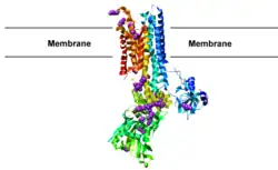 -ATPase with FHM2 mutations noted in purple: The N-terminus is colored blue and the C-terminus red. The approximate location of the cell membrane is noted. The original pdb file is available here.