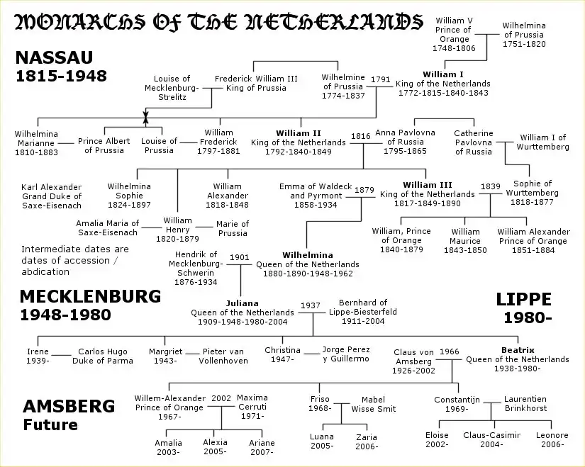 The following image is a family tree of the Monarchs of the Netherlands. Dates given are those of birth and death; for Monarchs of the Netherlands (shown in bold), the intermediate dates are dates of accession to the throne and (where applicable) abdication.