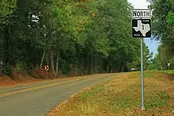 FM 1 begins in southwestern Sabine County near Pineland at a junction with US 96.[1] In Pineland, FM 1 is known as Temple Avenue and travels eastward and then northward through the town. North of Pineland, the road's name changes to Magasco Drive as it travels northward to the town of Magasco. Just south of Magasco, FM 1 Spur diverges from the main route and travels on the west side of the BNSF Railway tracks, while FM 1 crosses the tracks and runs to the east of them.[2]