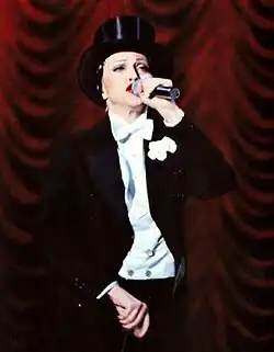 For many, her looks and style were "at the center" of her staging and creative performances.[21] While working with Madonna, costume designer Marlene Stewart commented in 1990, that for costumes the singer thinks in terms of story and character.[3] Arianne Phillips also remarked on her "ability to create characters and tell a story through costumes".[22] An observer also stated that she has extensively explored the roles she wishes to play when she grows up through clothing ever since.[4] In 1997, New York magazine called her self-exploration through fashion as "unprecendented" which mixes elements and explores "Western cultural history".[23] Writing for Vogue in 2023, Christian Allaire acknowledged her "fashion eras" and said like a "true artist", she sees what she wears as true performance art.[24] Madonna referred to fashion sense in various settings; in 2007, she told the press: "I've made no secret of my love for fashion and trends".[25] Laura Tortora from Vogue Italia felt how her interview with J. Randy Taraborrelli in 1983, reveals she was "aware" of her "great potential" which prompted to conclude she would make a legacy, not only in music, but also in "the history of costume".[26]