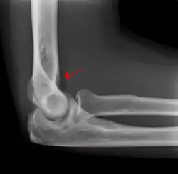 The fat pad sign, also known as the sail sign, is a potential finding on elbow radiography which suggests a fracture of one or more bones at the elbow. It may indicate an occult fracture that is not directly visible. Its name derives from the fact that it has the shape of a spinnaker (sail).[1] It is caused by displacement of the fat pad around the elbow joint. Both anterior and posterior fat pad signs exist, and both can be found on the same X-ray.