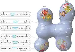 The above observations seemed incompatible with the classical 'head-to-tail' model for FAS organization, and an alternative model has been proposed, predicting that the KS and MAT domains of both monomers lie closer to the center of the FAS dimer, where they can access the ACP of either subunit (see figure on the top right).[25]