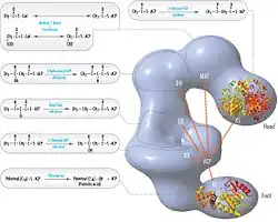 - ^ Stoops JK, Wakil SJ (May 1981). "Animal fatty acid synthetase. A novel arrangement of the beta-ketoacyl synthetase sites comprising domains of the two subunits". Journal of Biological Chemistry. 256 (10): 5128–5133. doi:10.1016/S0021-9258(19)69376-2. PMID 6112225.