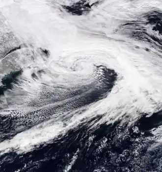![]() Satellite imagery from GOES-16 of the nor'easter at peak intensity on February 8 near Nova Scotia | |