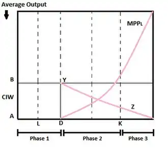 After AD, MP begins to rise, and industrial labor rises from zero to a value equal to AD. AP of agricultural labor is shown by BYZ and we see that this curve falls downward after AD. This fall in AP can be attributed to the fact that as agricultural laborers shift to the industrial sector, the real wage of industrial laborers decreases due to shortage of food supply, since less laborers are now working in the food sector. The decrease in the real wage level decreases the level of profits, and the size of surplus that could have been re-invested for more industrialization. However, as long as surplus exists, growth rate can still be increased without a fall in the rate of industrialization. This re-investment of surplus can be graphically visualized as the shifting of MP curve outwards. In Phase2 the level of disguised unemployment is given by AK.[4] This allows the agricultural sector to give up a part of its labor-force until