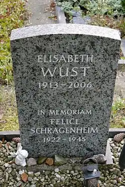 Elisabeth Wust went on to survive Felice Schragenheim by more than sixty years. After her death on 31 March 2006 and subsequent burial at Dorfkirche Giesensdorf (the cemetery of the Giesensdorf village church), in Lichterfelde (Berlin), Germany, a headstone memorializing her relationship with Schragenheim was placed on her grave.[11]