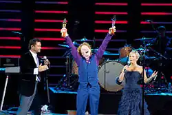 Camiroaga also hosted prime time programmes during the 2000s such as Con Mucho Cariño and Ciudad Gótica, both of which did not complete a full season for their "controversial contents", and the first two seasons of the reality show Pelotón.[21] In 2004 he co-hosted Pasiones with Bárbara Rebolledo, but he left the programme later that year and was replaced by Martín Cárcamo.[22] He returned to Buenos Días a Todos in 2005, sharing duties with Tonka Tomicic, then with Katherine Salosny, and finally Carolina de Moras. The replacement of Salosny by de Moras was not well received and the local entertainment media blamed Camiroaga for it, which later resulted in a mass booing while Camiroaga was being awarded a Premio Copihue de Oro for "Best TV presenter" at the Teatro Caupolicán in Santiago, in 2010.[23] In 2006, he began hosting his own talk show, Animal Nocturno.[17] In February 2009 he co-presented the Viña del Mar International Song Festival with Soledad Onetto, and also co-presented the 2010 edition.[17]