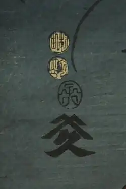 Kunisada entered Utagawa Toyokuni's studio from a young age, and was therefore granted access to training from the finest masters of the age, as well as valuable connections to publishers, poets' associations, theatres and actors[5] He began creating yakusha-e (actor images) in 1808, and this genre was to become the mainstay of his fame and fortune.[6] So esteemed and prolific was he in this area, that he earned the epithet "Kunisada, the Portraitist of Actors (yakusha-e no Kunisada)."[7] The Tempō Reforms of 1842, which had banned depictions of geisha, oiran courtesans and kabuki actors,[8] began to be gradually repealed from the late 1840s,[9] which left Kunisada free to return to his favourite medium.