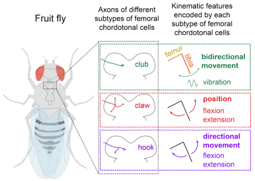 The sensory neurons of the femoral chordotonal organ encode various kinematic features of the femur/tibia joint including, position, speed, acceleration, and vibration.[14][15][16][17][18][19][20] In Drosophila, where it is possible to genetically track different subtypes of femoral chordotonal neurons, it is known that these different kinematic features are encoded by anatomically distinct subtypes of neurons mentioned above[12] (Figure 2). The position of the tibia is encoded by the claw neurons, vibrations are encoded by the club neurons, and the direction of the movement is encoded by the hook neurons.[12]