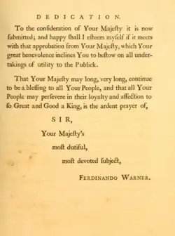 Warner's writings covered many subjects and according to Irish history scholar Robert Dunlop "show him to have been a man of wide learning and more than ordinary ability."[5] His earliest works centred on Church of England liturgy and theology, including a 1755 simulated debate on the nature of Revelation between Lord Bolingbroke and Robert Boyle.[8] In 1758, he wrote a biography of Sir Thomas More and appended Gilbert Burnet's 1684 translation of Utopia from the Latin with "slight Alterations" for modernity.[9] Its preface thanks Sir Robert Henley, 1st Earl of Northington, probably for having conferred upon him the rectory at Barnes.[10]