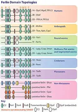 Ferlins are ancient proteins and they have been identified in protists and metazoans, and are known to exist in a range of organisms from unicellular eukaryotes to humans, suggesting primordial functions for ferlins.[7] More specifically, DysF domain and the last two C-terminal C2 domains followed by the C-terminal transmembrane domain (C2E-C2F-TM, containing approximately 489 amino acids) show a high degree of conservation. All ferlins contain several C2 domains. However, C2A may be missing in some ferlins.[7] More specifically, from six human ferlins, three of them do not contain C2A domains. Another highly conserved domain is the N-terminal C2-FerI-C2 sequence. FerI is a motif detected by Pfam, however, the function of this conserved motif is currently unknown.[7][10] Ferlins have been evolved into two groups, DysF-containing and non-DysF ferlins. Most invertebrates possess two ferlin proteins, one from each class. Most vertebrate however, have six ferlin genes, three of which DysF containing and the other three non-DysF ferlins, indicating that vertebrate ferlins are evolved and originated from the two ferlins in early metazoans. Both subgroups have been identified in early metazoans, suggesting the fundamental role associated to these proteins.[7]