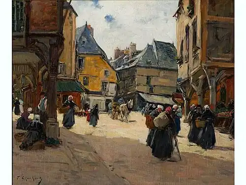 Other paintings by Legout-Gérard include "Le marché à Concarneau", "Le quai Pénéroff", "Thoniers dans la baie du soir", "Etretat", "Thoniers, soleil couchant" and "Le marché à Quingamp". Gout-Gérard involved himself closely in the affairs of Concarneau. He was the president of the "Comité de la fête des Filets bleus" an organization which strove to improve the lot of the local fisherman and took an active interest in preserving Concarneau's ramparts. Apart from his Brittany paintings he painted in Normandy, Venice, Greece, and North Africa. An exhibition of his work was staged in 2010 at the Musée du Faouët.[3]