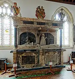- ^ To the right are shown Thomas's son George Luttrell (c. 1560 – 1629) kneeling next to the recumbent effigy of his first wife, with his arms above centre quartering Hadley. Erected by George's son Thomas Luttrell (died 1644), whose arms impaling Popham are shown at top right