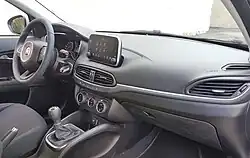 The interior of the Tipo has two different dashboards depending on the trim level. The base models have the upper part that integrates the radio or the Uconnect 5-inch infotainment system connected to the instrumentation, while the top models have the upper part with the tablet-style 7-inch Uconnect HD infotainment system. The lower part of the dashboard is identical for all versions and is inherited from the Fiat Punto (199). The right-hand drive models have a single dashboard for all trim levels, the same as the LHD models in the basic version with the upper dashboard connected to the instrumentation and which integrates the various 5-inch and 7-inch Uconnect infotainment systems.