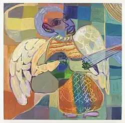 Early in his career he described himself as a "conscious syncretizer", saying he created art as a means of exorcising the pain of his exile from his war-torn homeland and of reclaiming his "sense of place," his "moral compass," and his "love for life."[7] In 2013, a critic wrote: "Ghebreyesus achieves syncretic brilliance. Framed by Eritrean crafts, textiles and architecture; the polyglot influence of world literature and philosophies; BeBop, modern jazz and polyrhythms of the African diaspora; as well as the masterworks of paintings populating the museums Ghebreyesus frequented, [his paintings] offer a survey of the myriad styles, mediums and scales that he worked in over his career."[13] A late painting, "Angel Musician II" (shown at right) suggests the many sources of influence in his work.