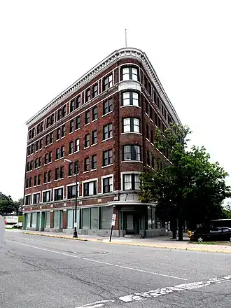 The Fidelity Building is a six-story Renaissance Revival reinforced concrete building with a brick veneer. It is roughly triangular in footprint, and has seven-bay-wide facades on both Pipestone and Michigan Streets. The facades merge in a curved corner portion at the intersection. The primary entrance to the upper floors is through a center entrance on Michigan Street; a secondary entrance is along Pipestone. The remainder of the street level facade contains a series of glass storefronts. Above, the second floor contains Chicago windows, with a large central pane flanked by narrow double hung windows. The upper floors have one-over-one double-hung windows. The facade is topped with a metal cornice.[3]