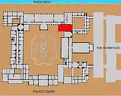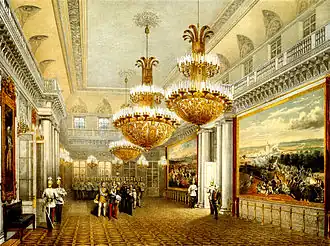The great fire, which destroyed the interior of the Winter Palace, began in this hall on 17 December 1837. It destroyed all in its path for over thirty hours.[2] Following the fire, the hall was rebuilt in its original style by the architect Vasily Stasov.