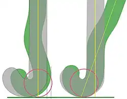 The extent of the stick head along the X+ axis, towards the 'heel' of the Head is confined by the rule requirement that the stick head and the handle meet in a smooth continuous fashion at the line C-C and by a rule restriction on the shape of the handle, which is that the stick-handle must not project beyond the line B1-B1. It is possible to envisage a stick where the width of handle did not extend beyond the line A1-A1, thus allowing a significant extension of the stick head along the X+ axis, but the practicalities of such a design seem to be limited and have not been explored. The length of the Head (or toe) along the X- axis has varied enormously, especially since the Second World War and again after the introduction of the timber lamination process in the early 1980s.