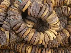 A fig cake, or cake of figs, is a mass or lump of dried and compressed figs,[1][2][3] usually formed by a mold into a round or square block for storage, or for selling in the marketplace for human consumption.[4][5] The fig cake is not a literal cake made as a pastry with a dough batter, but rather a thick and often hardened paste of dried and pressed figs made into a loaf, sold by weight and eaten as a snack or dessert food in Mediterranean countries and throughout the Near East. It is named "cake" only for its compacted shape when several are pounded and pressed together in a mold.