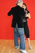 | Abrazo cerrado | V-shape close embrace | Salon and tango nuevo | The dancers' chests are closer to each other than their hips, and often there is contact at about the level of the chest (the contact point differing, depending on the height of the leader and the closeness of the embrace). In close embrace, the leader and the follower's chests are in contact and they are dancing with their heads touching or very near each other. |