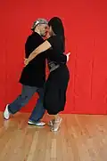 | Apilado (estilo milonguero, estilo del centro [de Buenos Aires]) | Square close embrace | Style milonguero | Milonguero style of embrace is danced in closed position, chest-to-chest, with the partners leaning – or appearing to lean – slightly toward each other to allow space for the feet to move. The follower's left arm position on the leader's shoulder is a style issue. It originates and is used in crowded milongas where there is so much people that you're literally dancing in "square". In those places the lifted arm avoids touching and accidentally hurting other people during turns. Close embrace, no V-shape. | ![]() |