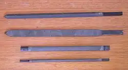There is no unitary international standard for file nomenclature; however, there are many generally accepted names for certain kinds of files. A file is "blunt" if its sides and width are both parallel throughout its length.[2] It is "tapered" if there is a reduction in its dimensions from its heel toward its point. A file may taper in width, in thickness, or both.[2] A "tang" is a protrusion at the heel, tapered, parallel sided, or conical, for gripping, inserting in a handle, or mounting in a chuck.[2]