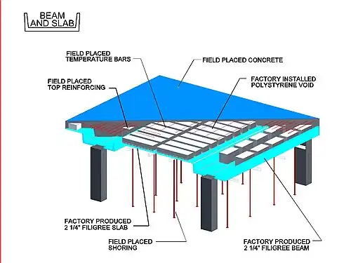 The Filigree Wideslab method is a process for construction of concrete floor decks from two interconnected concrete placements, one precast in a factory, and the other done in the field. The method was developed during the late 1960s by Harry H. Wise as a more efficient and economic construction process than conventional cast-in-place technologies.[1]