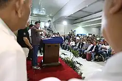 ![]() Philippines Labor Secretary Silvestre Bello III (right) speaking to a group of Filipino workers stationed in Saudi Arabia in 2016 | |