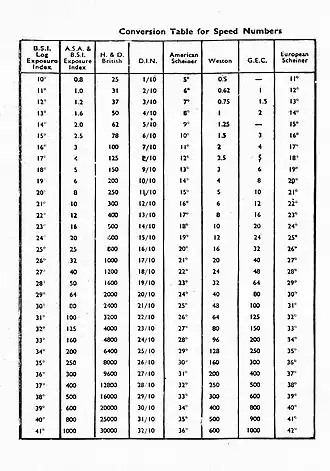 When BS 935:1941 was published during World War II, specifying exposure tables for negative materials, it employed the same fixed-density speed criterion used in the German DIN 4512:1934 system. The British Standard also used logarithmic speed numbers, following the example of Scheiner and DIN. When the American ASA Z38.2.1:1943 standard was published, it used a fractional gradient speed criterion and arithmetic speed numbers, for compatibility with Weston and GE.[20]