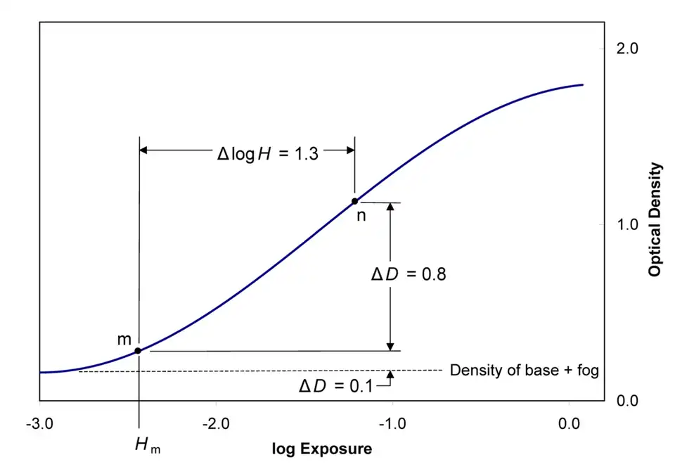 The inertia speed point of an emulsion is determined on the Hurter and Driffield characteristic curve by the intercept between the gradient of the straight line part of the curve and the line representing the base + fog (B+F) on the density axis.