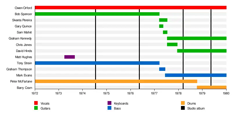 In March 1977 Spencer left to replace Red Symons on guitar in Skyhooks.[1][3] Tony Strain left the band at the same time.[1] From April to July the band went through nine different members (including Sam Mallett, Skeeta Pereira, Gary Quince, and Graham Thompson) before Peter McFarlane and Orford were joined by Mark Evans (ex AC/DC) on bass guitar, Graham Kennedy on guitar and vocals, and Chris Jones on guitars.[1][3][6] The band signed to CBS / Epic Records and issued the single, "One More Time" in October 1977[6] and they started recording material for their second album in the following month.[6] Dave Hinds (ex-Marshall Brothers, Rabbit) replaced Chris Jones (who joined Feather) on guitar and vocals in December.[1][3]