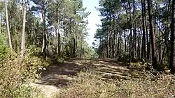 A firebreak or double track (also called a fire line, fuel break, fireroad and firetrail in Australia) is a gap in vegetation or other combustible material that acts as a barrier to slow or stop the progress of a bushfire or wildfire. A firebreak may occur naturally where there is an absence of vegetation or "fuel", such as a river, lake or canyon. Firebreaks may also be man-made, and many of these also serve as roads, such as logging roads, four-wheel drive trails, secondary roads, or highways.