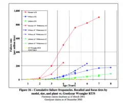 The belt wedge and skim rubber compounds change as they age. Skim rubber is a thin strip of rubber sandwiched between the inner and outer belts and the belt wedge is a thin strip of rubber installed along the outer edge of the tire between the two steel belts and in the area of highest stress on the tire. These changes reduce the ability of the tire to resist crack growth and belt separation.[15] Most of the tread separations occurred on tires that had been in service for at least three years.[15] ATX and Wilderness AT tires manufactured in Decatur started to fail between one and two years after production, but between two and three years for tires from Wilson and between three and four years for tires from Joliette.[15] Tire aging for Wilderness AT tires, regardless of the factory that produced them, was similar to other tires manufactured at Decatur and was worse than comparable tires manufactured by Goodyear.[15]