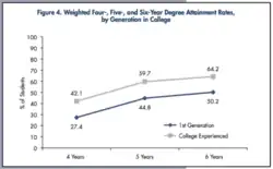 DeAngelo[73] provides statistics on graduation rates among FGCS and non-FGCS in a framework of four, five, and six years as well as a table that breaks down the degree attainment by race/ethnicity. These images from the study provide a breakdown, and show the huge gaps in degree attainment.[73] A new study revealed that only 27 percent of first-generation students will earn a bachelor's degree within four years of entering college, lagging far behind their continuing-generation peers.[74]