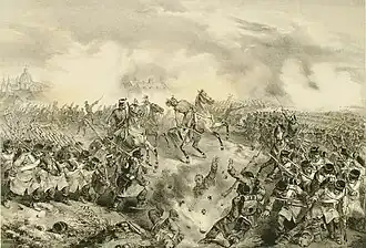 Then came to the scene the commander of the 3rd battalion, Major Károly Földváry, the hero of the Battle of Tápióbicske, with the banner of his battalion in his hand. He went to the standard-bearer of the Polish Legion, and wanted to take the flag of them in his hand, wanting to lead both the 3. battalion and the Polish soldiers to attack against the Austrians, but the standard-bearer resisted, saying: Wont attack, let the Hungarians go to attack.[23] The Polish standard bearer was probably afraid that he will be executed if he lets the flag of his unit to be taken by somebody from another unit, as it happened to the standard-bearer of the 9. battalion when the same Földváry took their flag in his hand in the battle of Tápióbicske.[24] Földváry then went to Knezić's division's 9. battalion, called the "Red Hatted" battalion, which together with his 3. "white feathered" battalion, were regarded as the bravest battalions of Damjanich's III. corps, and led them to attack against the bridge.[23] Here fierce hand-to-hand combat ensued with the Austrian 3/LXIIII battalion, as the result of which the Austrians were pushed back, the Hungarians taking half of the bridge.[23] Then Földváry took the flag of his battalion and rode onto the bridge with it, followed by the 3. and 9. battalions, under a hail of bullets from the 3/LXIIII battalion and the 12. kaiserjäger battalion. Földváry's horse was shot dead in seconds, as a result of which the Hungarian battalions stopped, fearing that their leader was killed, but he went back to his soldiers, took another horse and rode up the bridge again, and the same thing happened: the second horse fell down beneath him in a second, but he remained unharmed.