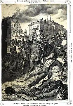 One of the Polish Legion's medics took care of Götz's wounds. On 11 April Görgey arrived in Vác, and one of the first things he did was to visit Götz and ask how he was feeling. But because of his wound, Götz had lost his ability to talk, could not respond. His last wish was to be buried together with his ring. He received extreme unction from a Hungarian army chaplain, who prayed next to him until he died.[22] Götz was buried on 12 April, his coffin being carried by Hungarian soldiers on their shoulders accompanied by military music and drumbeat, in front of the Hungarian soldiers and the Austrian prisoners. The coffin was lowered to the grave by three generals: Görgey, György Klapka, Damjanich and a staff officer.[28] In 1850 Götz's widow showed gratitude for the care and respect paid to her husband by his enemies, by donating 2,000 forints to the military boarding school in which her husband had spent his last hours.[29]