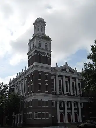 First Calvary Baptist Church is a historic African-American Baptist church located in Norfolk, Virginia. It was built in 1915 and 1916 and is a four-story, 11 bay, brick church building in the Second Renaissance Revival style. The building features decorative terra cotta and a stained-glass dome. It has a two-tier, engaged entrance portico with fluted columns, Corinthian order capitals, and terra cotta entablatures. The building also has a three-stage bell tower.[3]