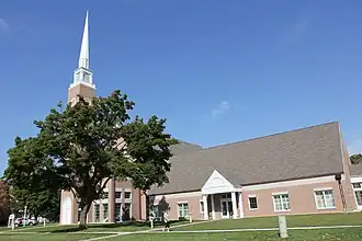 First Congregational Church in Beloit, Wisconsin was built in 1859 from a design by Lucas Bradley, blending elements from Greek Revival and Romanesque Revival styles.[2] It was added to the National Register of Historic Places for its architectural significance on January 23, 1975. On August 24, 1998, the historic building was damaged by fire, after which it was razed and replaced with a new building, which is pictured.[3]