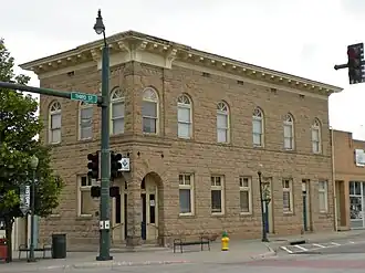 significant for its architecture. It is an excellent intact example of the Late Victorian design with many elements of Romanesque Revival style.... The two-part corner commercial building is faced with rock-faced rhyolite stone that was quarried outside of Castle Rock. This building was the second home for the bank and represents economic shifts occurring in the community as the bank sought a more permanent home during a time of community growth and as the bank shifted from out of state "back East" investors to local ownership.[2]