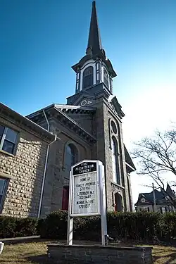 The first church building was erected in the 1786 at the time Rev. Ira Condit, a 1784 graduate of Princeton University was installed as the congregation's first pastor. This first edifice was razed for a larger, second building at the site, erected 1828-1829. The third and present edifice was built in 1869–1872 of native blue limestone and described as being "plain but beautiful...in its simple style of architecture."[1][2] While described as simple, the building is a combination of architectural styles that is chiefly Italianate and Renaissance Revival architecture but incorporates elements associated with the Classical Revival and Romanesque Revival styles.[2] The church was damaged in an 1893 fire, and restored with funds from parishioners, including Newton industrialist Henry W. Merriam (1828–1900). At this time, Merriam donated several stained glass windows, including one over the altar depicting Jesus Christ in the Garden of Gethsemane.